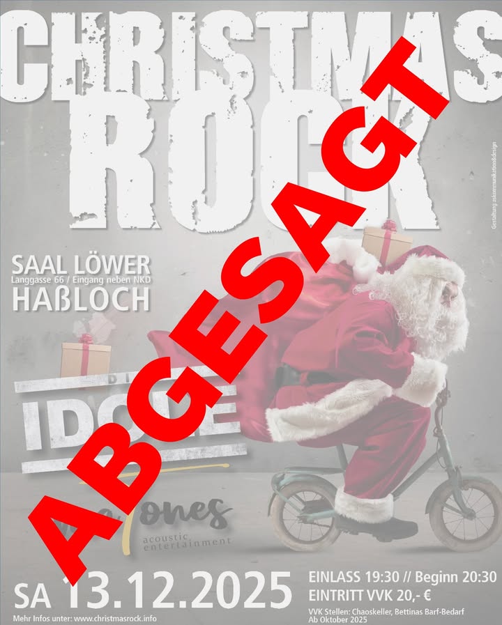Hallo Zusammen! Leider müssen wir euch informieren, dass die Veranstaltung „Christmas Rock“ im Dezember abgesagt wurde. Weitere Infos in dem geteilten Beitrag des Veranstalters. Wir